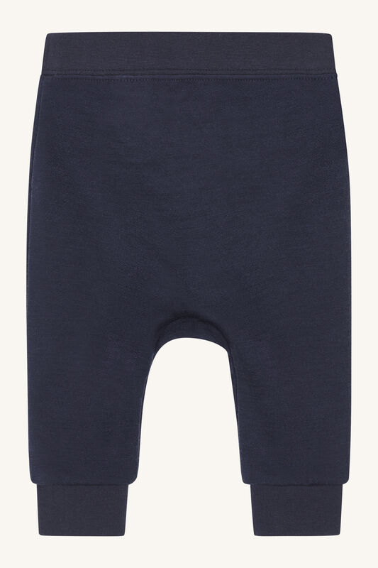 Marineblå joggebukser i behagelig, elastisk ull og bambusviskosekvalitet med knyting og strikk i midjen og baggy passform. Dette produktet er Oeko-Tex 100®-sertifisert.