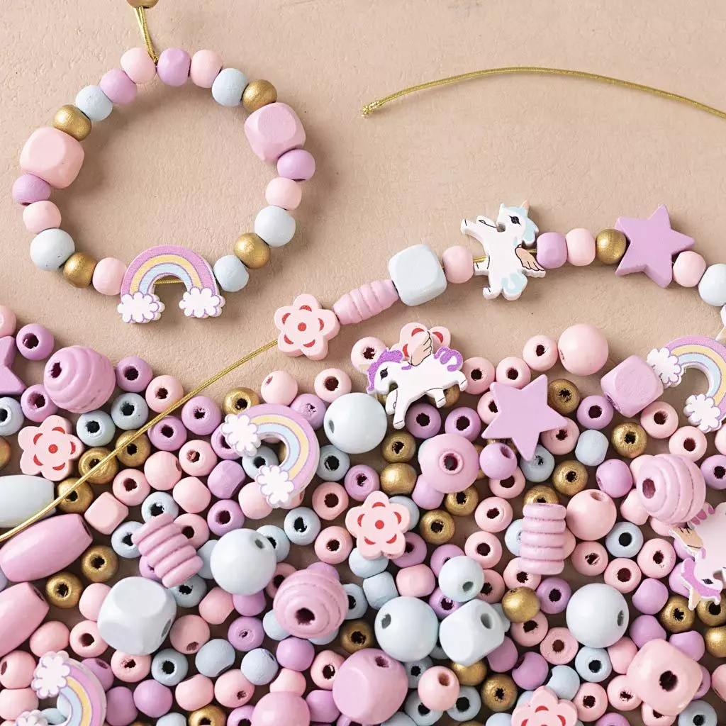 Hvis barna vil lage perlesmykker i vakre farger, er dette Mini DIY Kit perfekt for deg. Det inneholder alt du trenger for å komme i gang. Treperlene kommer i forskjellige størrelser, former og farger – og barna kan fritt kombinere dem akkurat slik de ønsker. Tips: Bruk en stoppenål uten tupp til den elastiske snoren som følger med, slik at du enkelt kan træ snoren gjennom perlene.